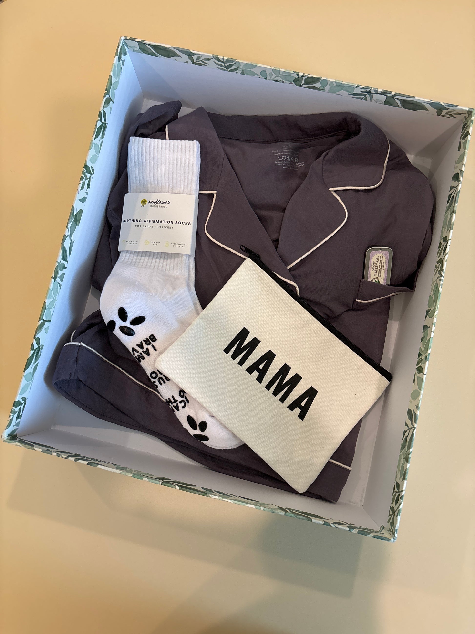 Inside, she’ll find a small white “Mama” tote—perfect for the on-the-go mama. This cute and compact bag offers a stylish way to carry everyday essentials. A locally made lavender salve, a soothing balm for dry or irritated skin infused with calming lavender to add a touch of relaxation to her day.